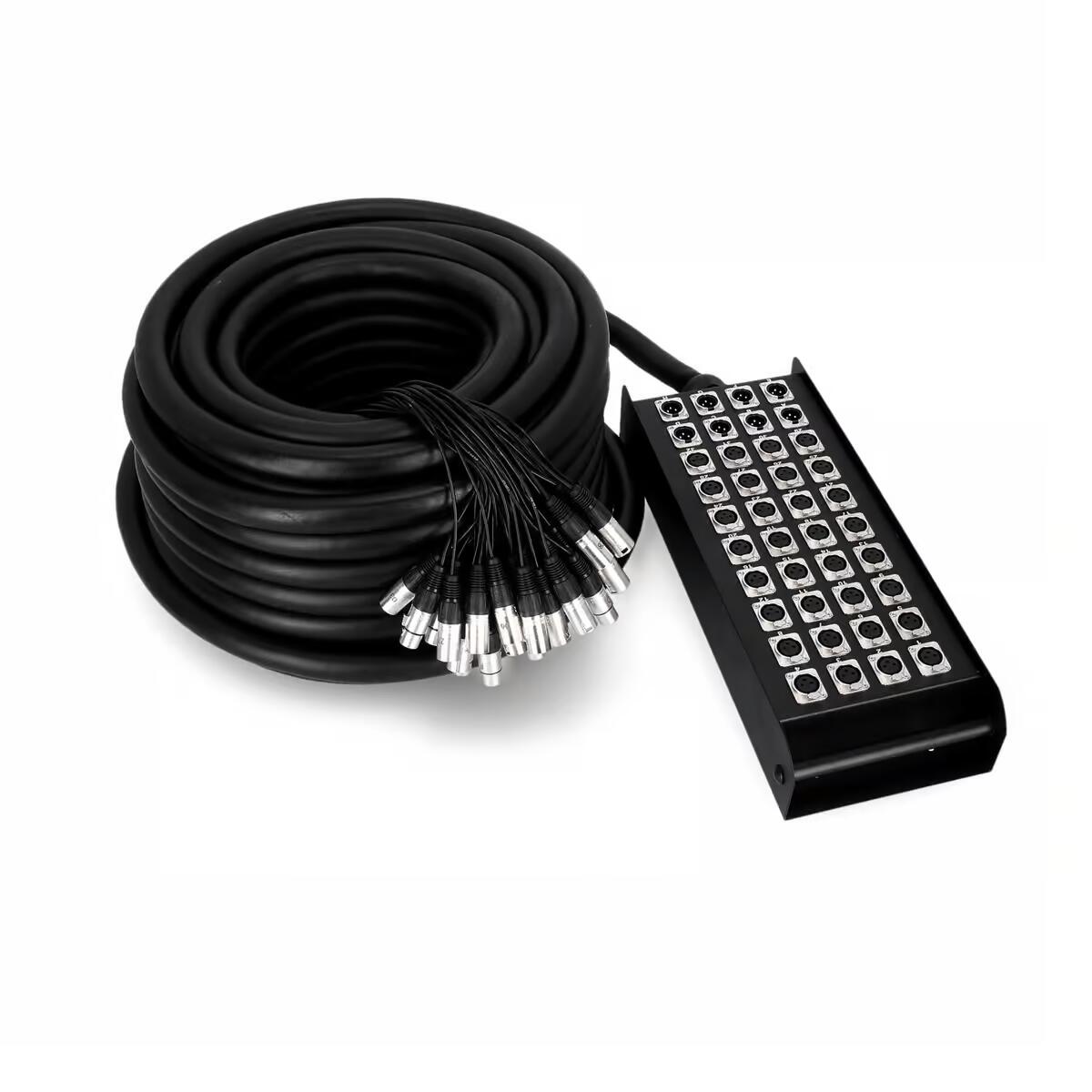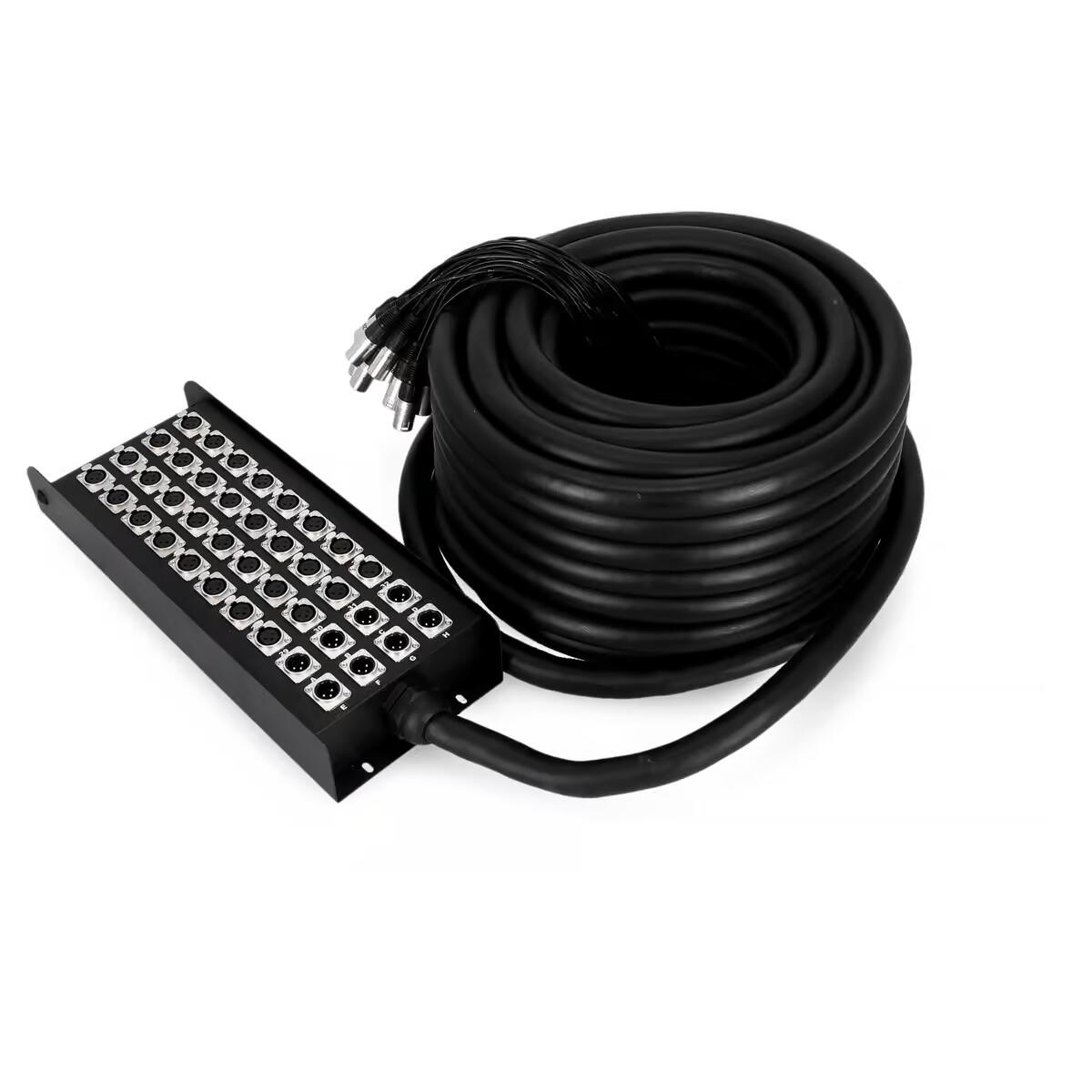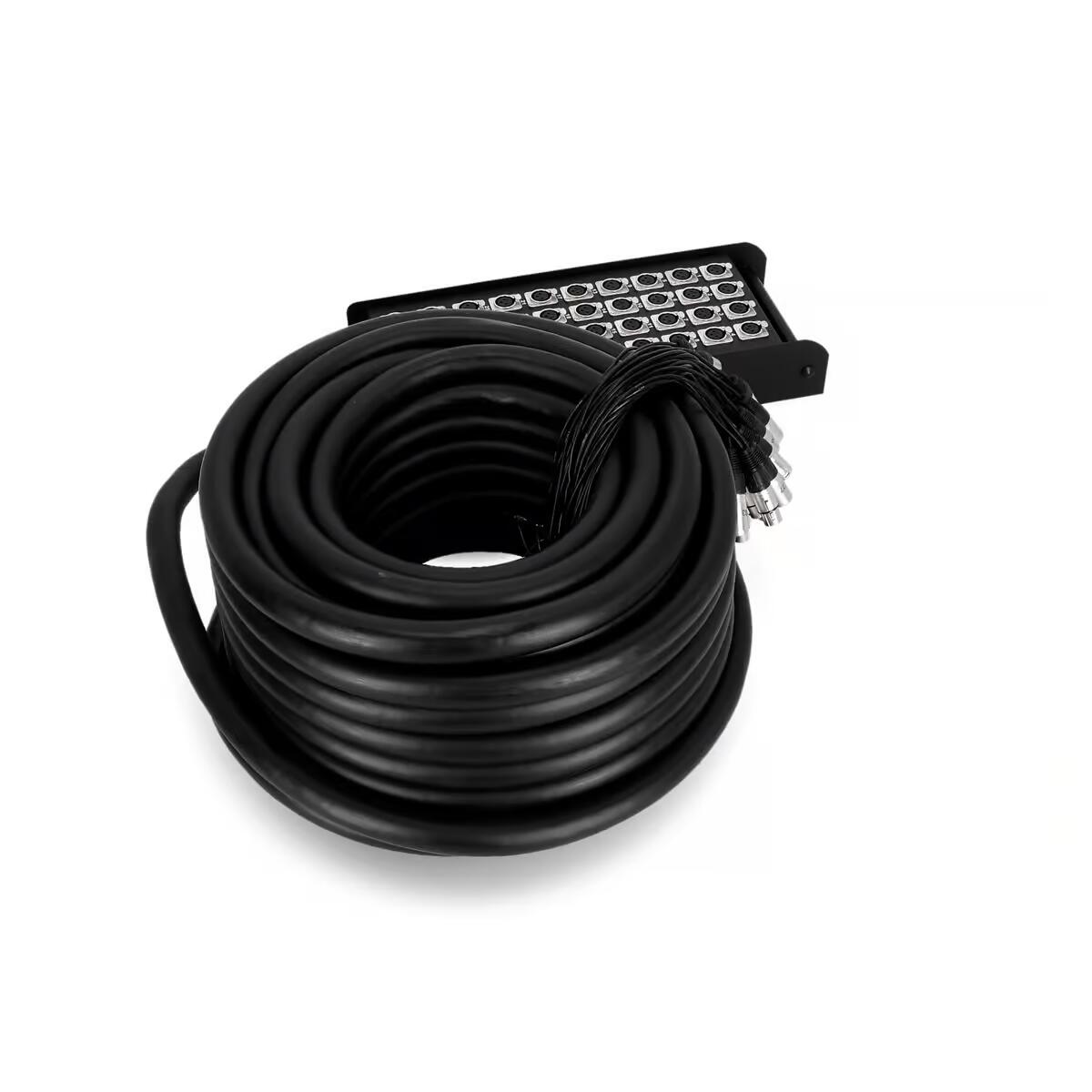 Corpo resistente in lamiera d'acciaio con rivestimento a polvere nero e maniglia integrata. Tutte le prese e i connettori sono dotati di finitura in metallo. Multicore di alta qualità con codice numerico sullo splitter.