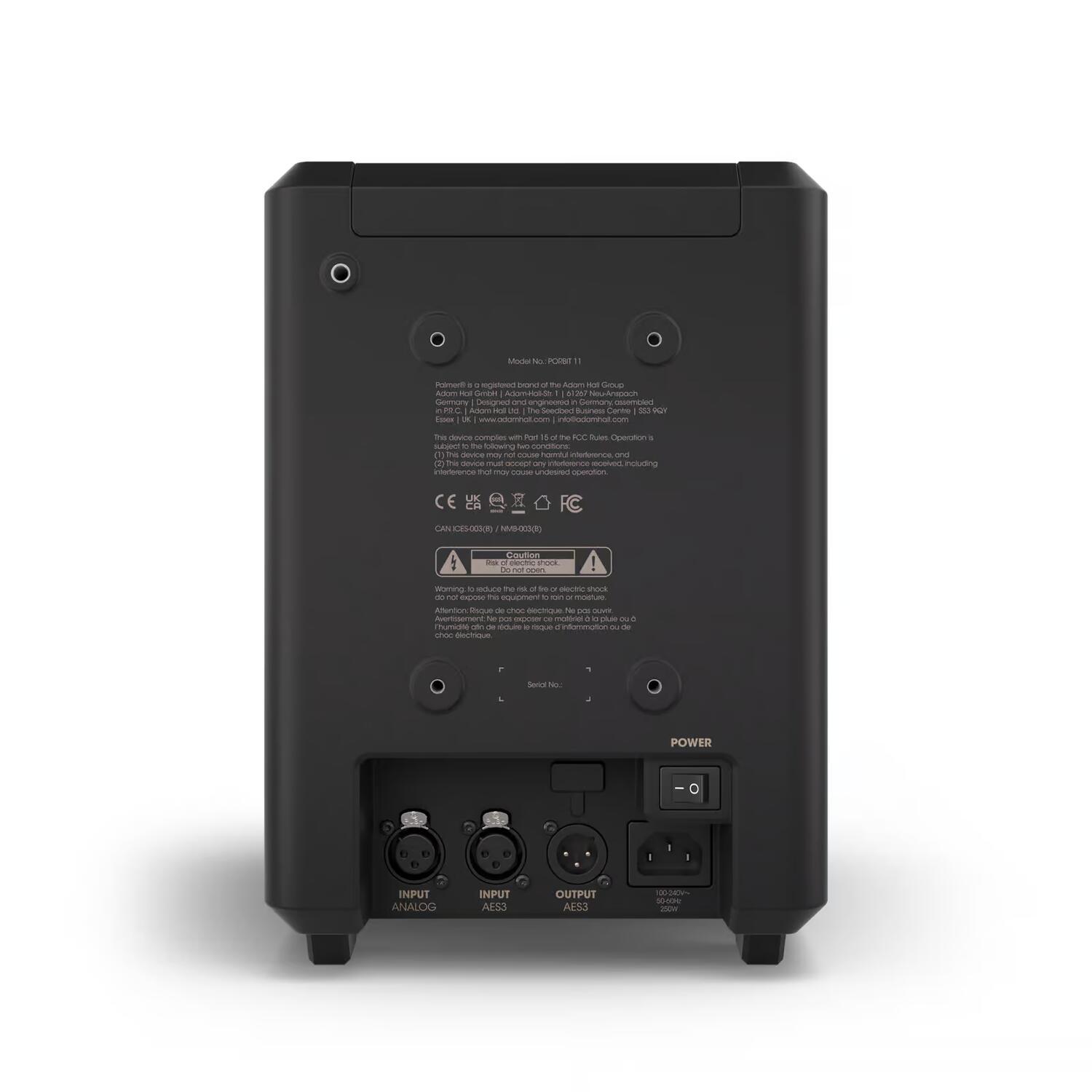 Per una rapida configurazione, il pannello di controllo montato in alto consente di accedere direttamente al pad d'ingresso, all'equalizzatore a 3 bande, ai preset da scrivania e parete posteriore e al filtro passa-alto da 80 Hz. Le opzioni di connettività includono un ingresso di linea XLR bilanciato e AES3 tramite XLR, con un'uscita Thru AES3 per il collegamento a margherita.