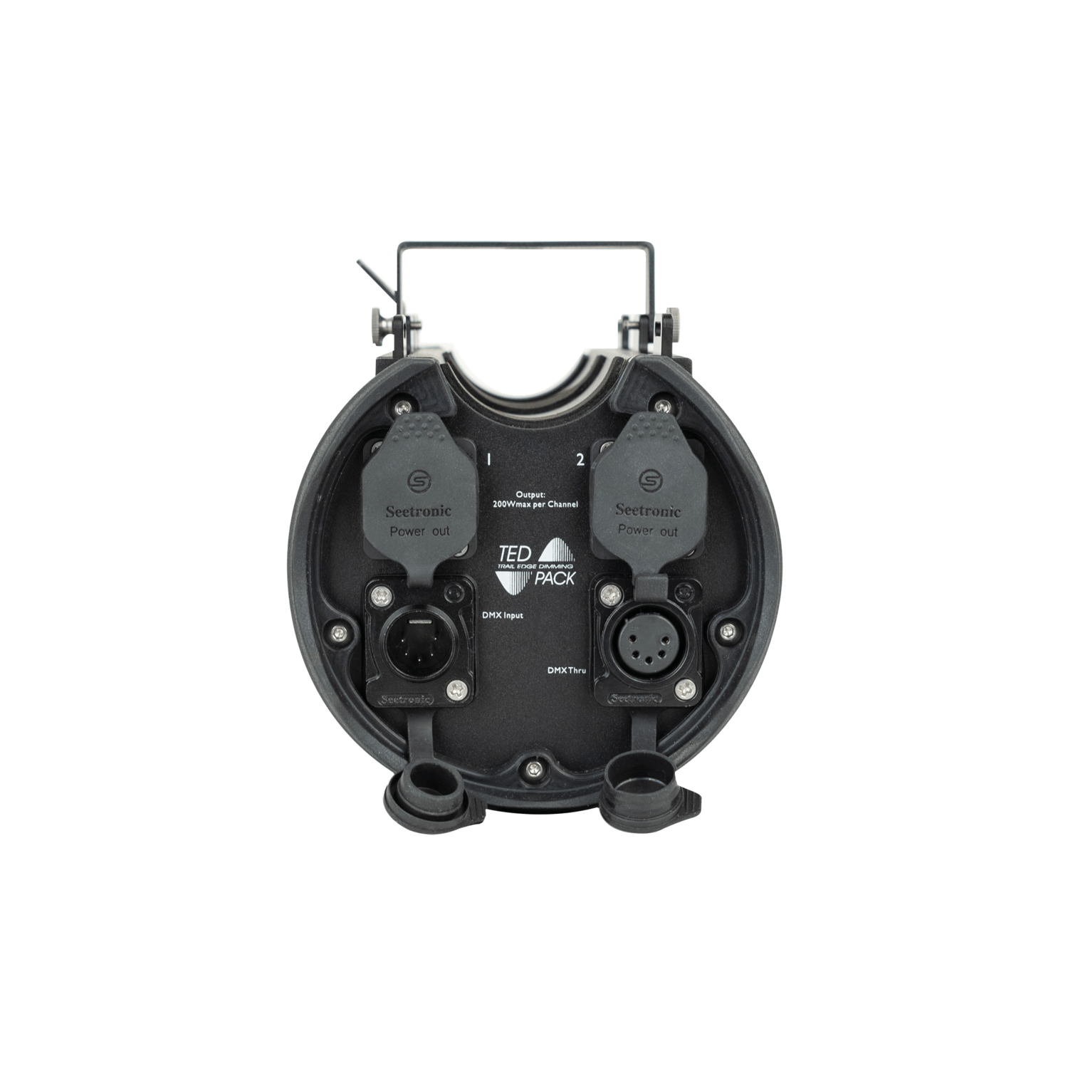 Lo Showtec TED Pack IP è un dimmer leading e trailing edge da 500 W a 2 canali con grado di protezione IP65 per uso esterno temporaneo. Dispone di modalità dimmer, switch e FX, è compatibile con RDM ed è dotato di robusti connettori Seetronic. Le uscite sono indipendenti dal carico collegato e possono essere utilizzate con LED e lampade a incandescenza fino a 2 A suddivise sui due canali. Il TED Pack IP utilizza i MOSFET per attenuare l’uscita e può essere commutato tra l’attenuazione leading edge e trailing edge. La modalità Special FX offre un canale di sicurezza che impedisce l’attivazione involontaria, che può essere utile per controllare sparacoriandoli, cannoni, sistemi di caduta, ecc. L’unità può essere controllata manualmente e via DMX e RDM.