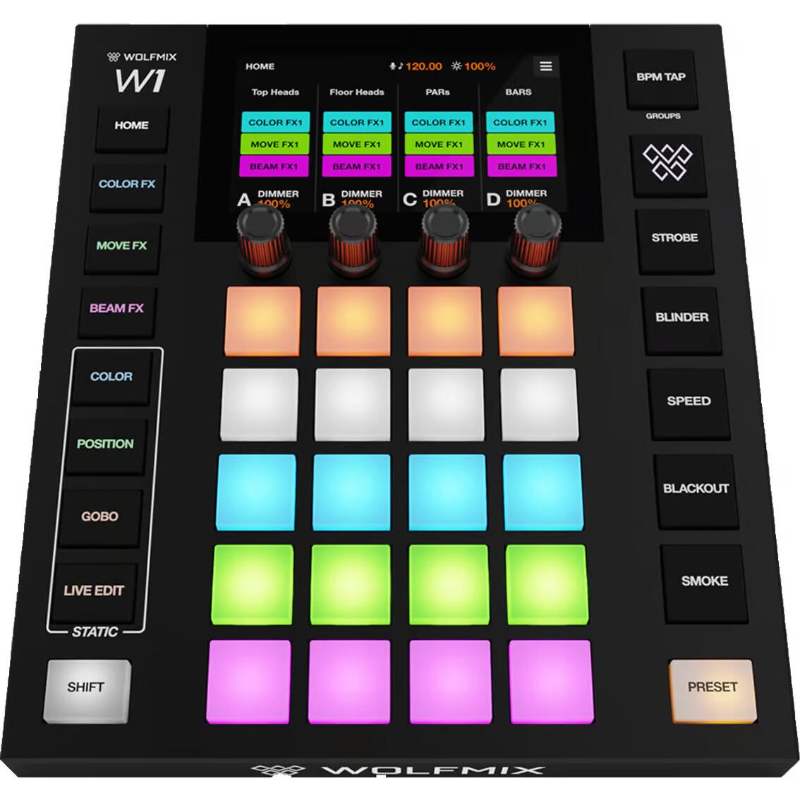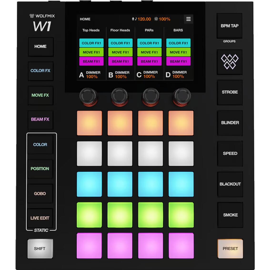 Un arsenale di moduli FX, sincronizzazione musicale e fino a 4 universi DMX, il tutto racchiuso in un hardware robusto con un potente processore. Scegli tra migliaia di apparecchi di illuminazione o creane di personalizzati direttamente all'interno del controller. Che si tratti di un'esibizione dal vivo, una discoteca, un club o uno spettacolo, Wolfmix ha la soluzione giusta per te.
