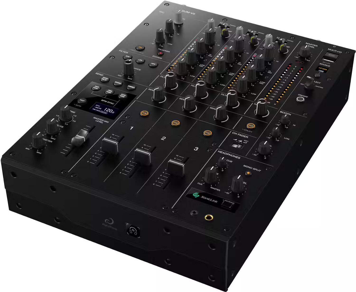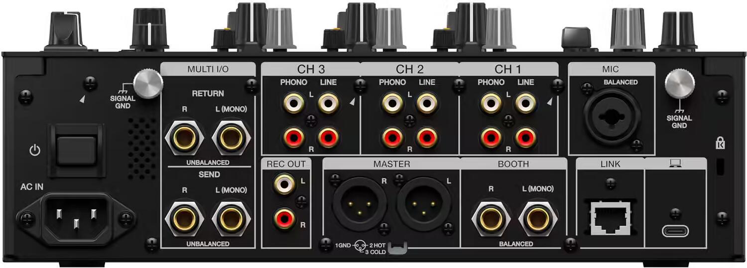 Ogni canale è dotato di un filtro dedicato con tre tipi selezionabili (passa-basso, passa-alto, cross-pass) e di uno sweep progettato per effetti delicati o netti. La sezione Send FX offre sei effetti di elaborazione musicale: "Short Delay", "Reverb", "Shimmer", "Tape Echo", "PingPong" ed "Echo-Verb", controllati tramite un potenziometro di mandata per canale. Il motore a 96 kHz/64 bit, abbinato ai convertitori ESS a 32 bit, garantisce un'immagine precisa e un rumore di fondo minimo. Per il trasferimento dati, le doppie porte USB-C (sul pannello posteriore e superiore) semplificano l'utilizzo con rekordbox , Serato DJ Pro (licenza richiesta) e DJM-REC su iPhone/iPad con USB-C, mentre le porte USB send/return e MULTI I/O facilitano l'integrazione di un processore esterno. Il SonicLink integrato consente l'associazione diretta con cuffie compatibili (HDJ-F10) per un monitoraggio senza cavi, ideale per la moderna cabina.
