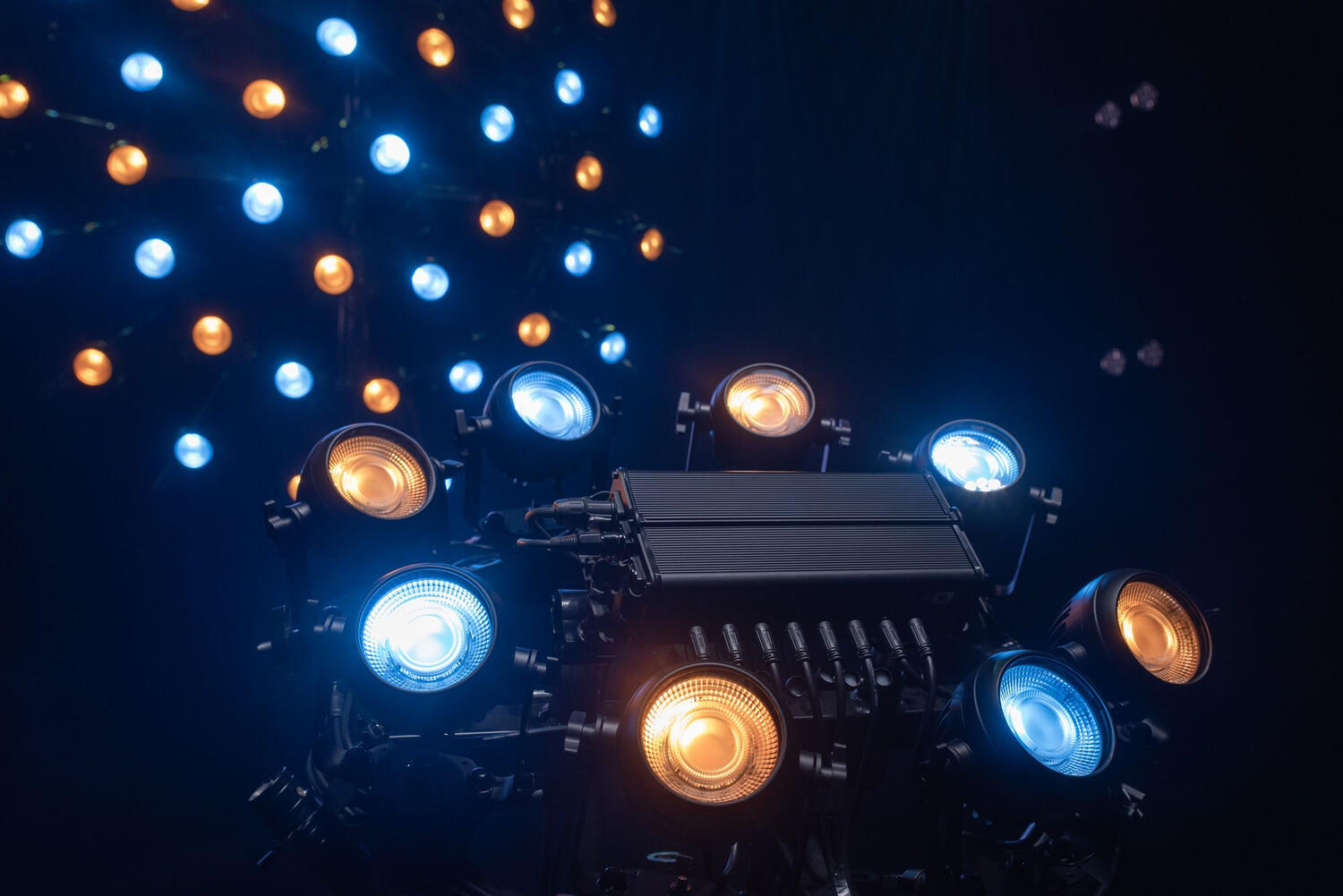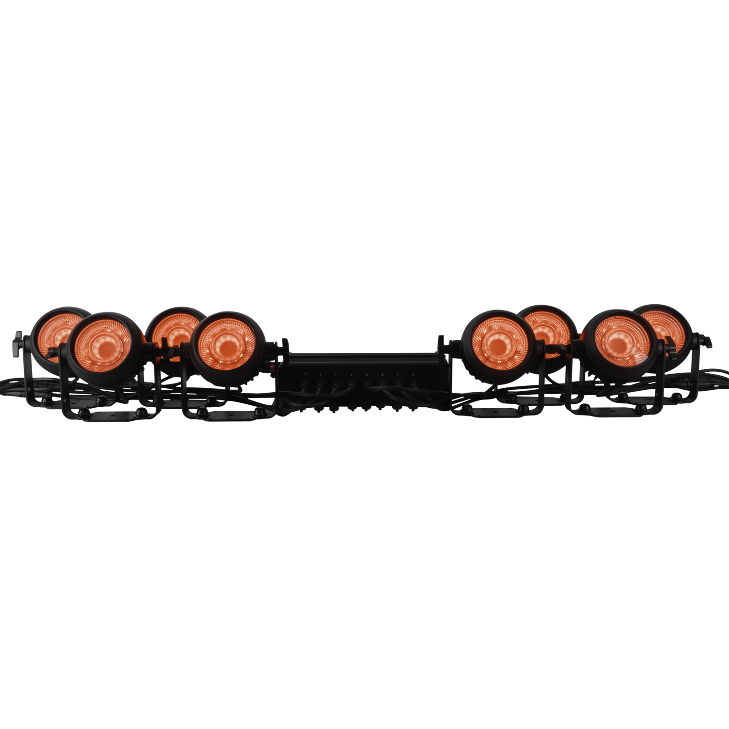 Il Titan Strobe FLEX FX di Showtec è un set di 8 strobo LED ad alta potenza e un controller dedicato. Ogni singolo pod è dotato di un potente LED COB bianco freddo da 100 watt per lo strobing e di un anello di 12 LED RGBW da 2 watt controllabili individualmente. I LED RGBW integrati permettono di creare effetti unici di anelli LED a colori. La potente sorgente luminosa a LED combinata con la funzionalità strobo permette di utilizzare il Titan Strobe FLEX FX come luce stroboscopica con effetti cromatici brillanti. Utilizza una lente Fresnel per creare l’angolo del fascio ottimale. L’effetto luminoso può essere controllato tramite DMX/RDM, Art-Net, sACN e Master/Slave, ma può anche funzionare in modalità stand-alone con diversi programmi integrati.