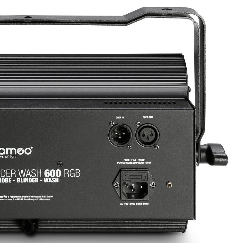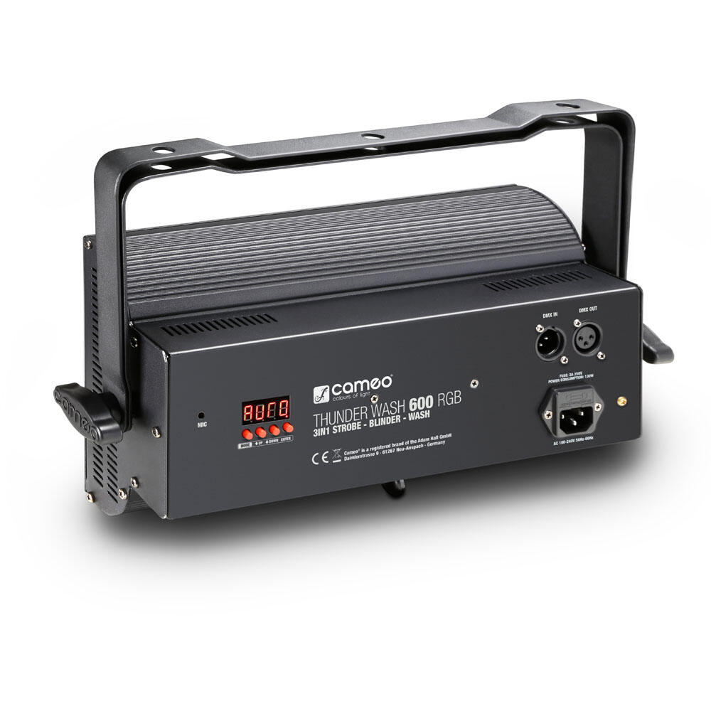 La Thunder Wash 600 RGB dispone di connettori XLR a 3 poli per l’ingresso e l’uscita DMX, 8 modalità DMX con funzioni dimmer, frequenza e durata flash nonché possibilità di utilizzo come master, slave o stand-alone. Un display a LED di facile lettura con tasti Mode, Enter, Up e Down consente il comando manuale; il microfono incorporato consente la funzionalità Sound Control.