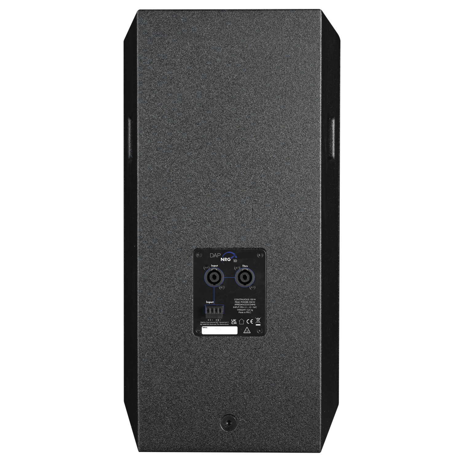Il cabinet in compensato leggero ma robusto ha un cappello a doppia angolazione (0° e 5°) che consente di puntare il cabinet verso il basso in caso di montaggio su un palo. UtiIl DAP NRG-10 è un altoparlante a gamma completa passivo classificato al picco di 550 watt (RMS continuo di 150 watt). Utilizza un woofer da 10” e un driver di compressione da 1”. Con una sensibilità di 94 dB/W/m, l’NRG-10 riproduce comodamente fino a 115 dB con picchi fino a 127 dB. Il driver di compressione è accoppiato a una tromba girevole con direttività di 90°x60°. Il woofer ha un punto di interruzione basso di 70 hertz (-6 dB).lizza connettori di ingresso e passanti per diffusori a 4 poli e offre un connettore terminale a 4 pin aggiuntivo, particolarmente utile per applicazioni di installazione permanente. Per ottenere il massimo dall’NRG-8, consigliamo di utilizzare un filtro passa-alto di 4° ordine a 60 hertz e di aggiungere un subwoofer della serie NRG.