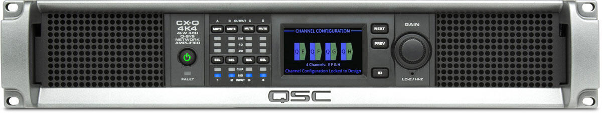 Amplificatore di potenza a 4 canali in Classe H sviluppato per la piattaforma audio di rete Q-SYS (TCP-IP) con DSP integrato e 4 in e 4 out integrati gestibili dalla piattaforma Q-SYS. Tecnologia FAST Channel Combining per somma della potenza totale dell’amplificatore in sulle le uscite permettendo configurazioni di canali in parallelo o in bridge per il massimo rendimento di corrente e tensione. Tecnologia FlexAmp con distribuzione della potenza in funzione delll’esigenza del canale. DSP a bordo che include funzioni tra cui Crossover, EQ, Limitazione e allineamento in Delay eliminando la necessità di processori per altoparlanti esterni. Display frontale per la gestione e visualizzazione delle principali funzioni. Potenze RMS 4x1000W/8ohm e 70-100Volt , 4×1500/4ohms (A,B,C,D), 4x800W/2ohm (A,B,C,D),2x3000W/8ohm in bridge (A+B, C+D), 2x1700W/4ohm in bridge (A+B, C+D), 2x2000W/70-100 V in parallelo (AB, CD), 2x2000W/4ohm in parallelo (AB, CD), 2x2500W/2ohm in parallelo (AB, CD), 2x2000W/140-200 Volt in bridge (A+B, C+D), modalità anche in parallelo 3-4 canali, per carichi impedenza fino a 1 ohms (4000 watts). 8 GPIO programmabili con funzione tasto, VCA o uscita. Dimensioni 89 × 482 × 406 mm 2 unità rack 19″. Peso 13,2 kg.