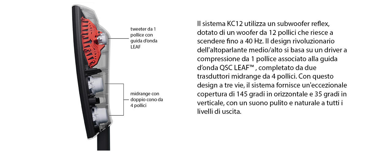 Sistema di altoparlanti a 3 vie con subwoofer con cono da 12 pollici (305 mm), 2 driver da 4” ad alta escursione per midrange e 1 driver a compressione da 1 pollice (25,4 mm) per le alte frequenze combinato con la guida d’onda brevettata QSC LEAF™