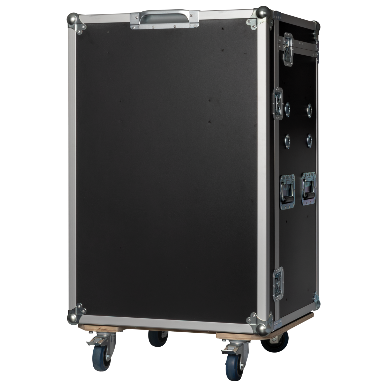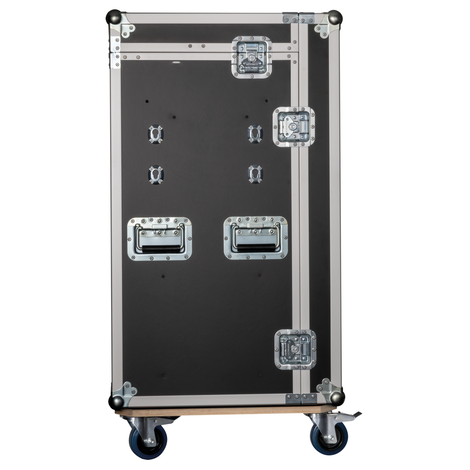 Il flight case è costruito con chiusure a farfalla Penn Elcom per una lunga durata. Cinque maniglie ergonomiche assicurano una manipolazione confortevole, mentre quattro ruote girevoli con freno garantiscono una mobilità fluida e un posizionamento sicuro. È incluso un porta-etichetta per una rapida identificazione durante il trasporto o lo stoccaggio.