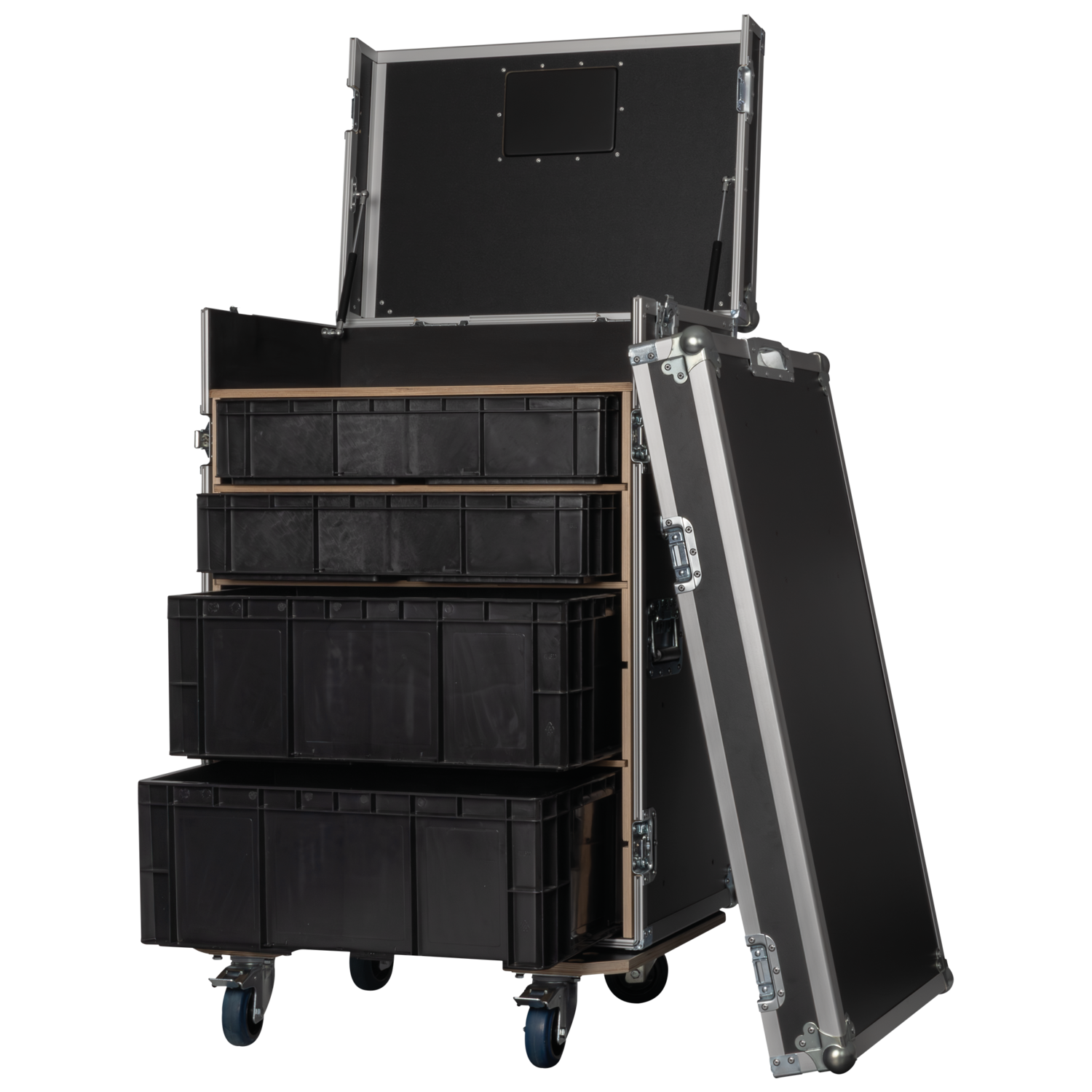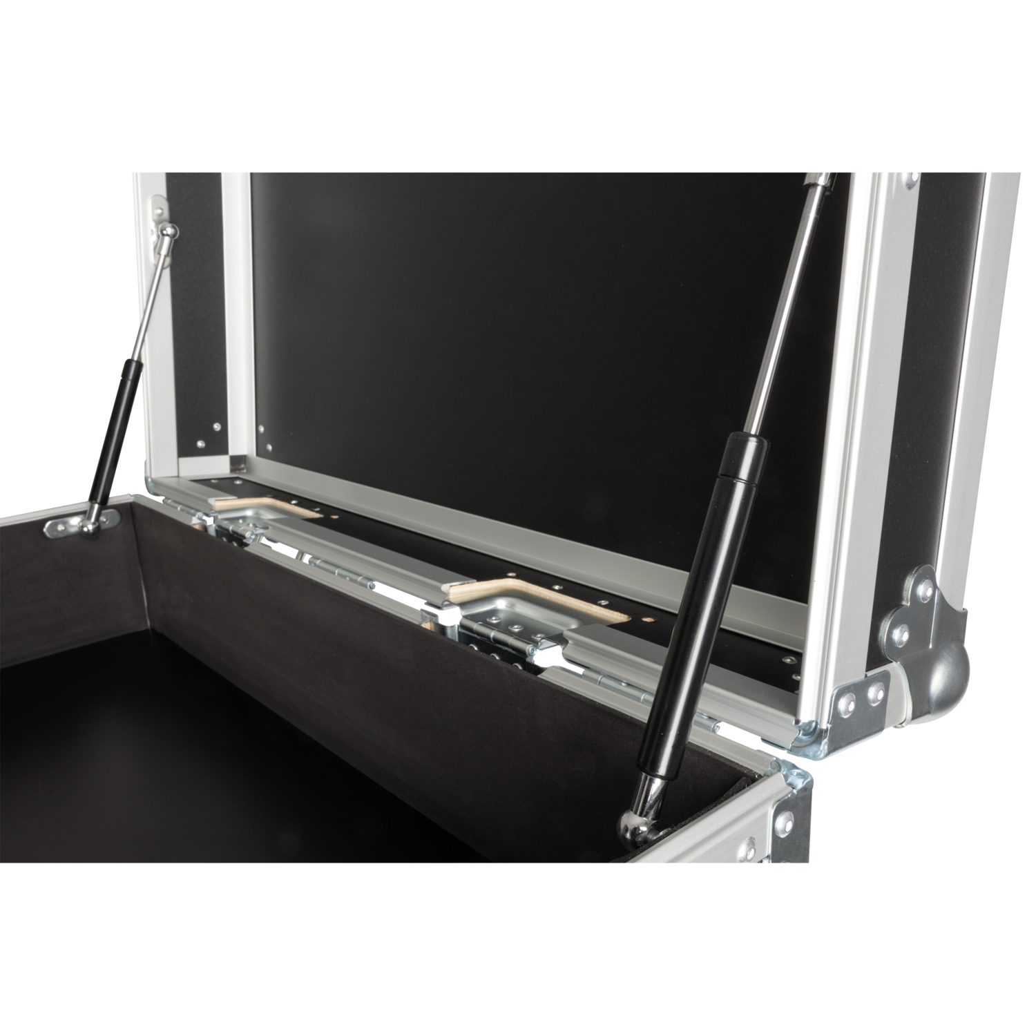 Le sue caratteristiche principali sono le due superfici di lavoro integrate. Il coperchio anteriore, completamente staccabile, si trasforma in un banco di lavoro stabile, sostenuto da due cavalletti integrati e regolabile tra due altezze di lavoro (31” o 35” / 80 o 90 cm) per adattarsi a diversi compiti. Questa superficie di lavoro può essere fissata su entrambi i lati del flight case per ottenere la massima flessibilità. Inoltre, il coperchio superiore incernierato è dotato di molle a gas, che consentono di utilizzare la parte superiore del flight case come seconda superficie di lavoro.