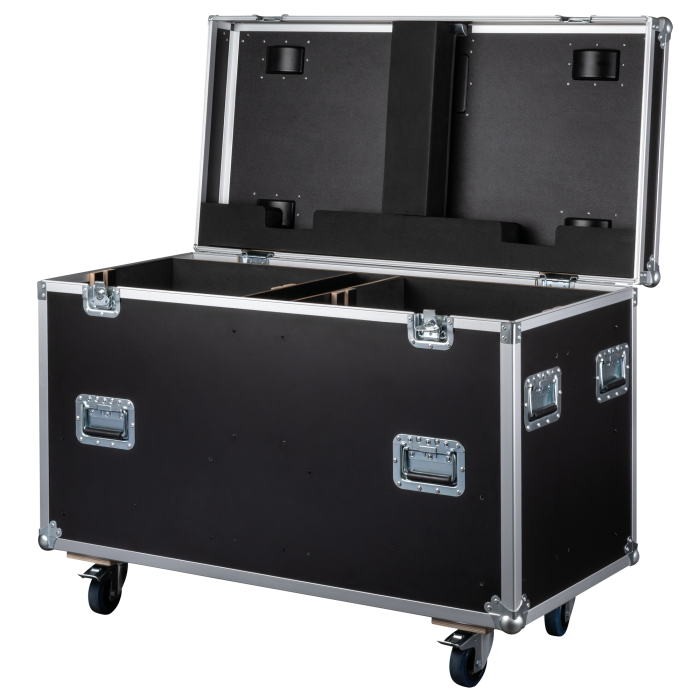 La Showtec case per 2x Showtec Goliath è un flight case dedicato per due effetti luce retrò Goliath. L’interno con schiuma preformata mantiene due apparecchi sicuri e protetti durante il trasporto e lo stoccaggio. Il flight case è costruito in compensato resistente da 9 mm, con maniglie incassate in punti strategici per facilitare la movimentazione e chiusure a farfalla Penn Elcom per mantenere il coperchio chiuso. È dotato di 4 ruote girevoli con freni per una facile manovrabilità.