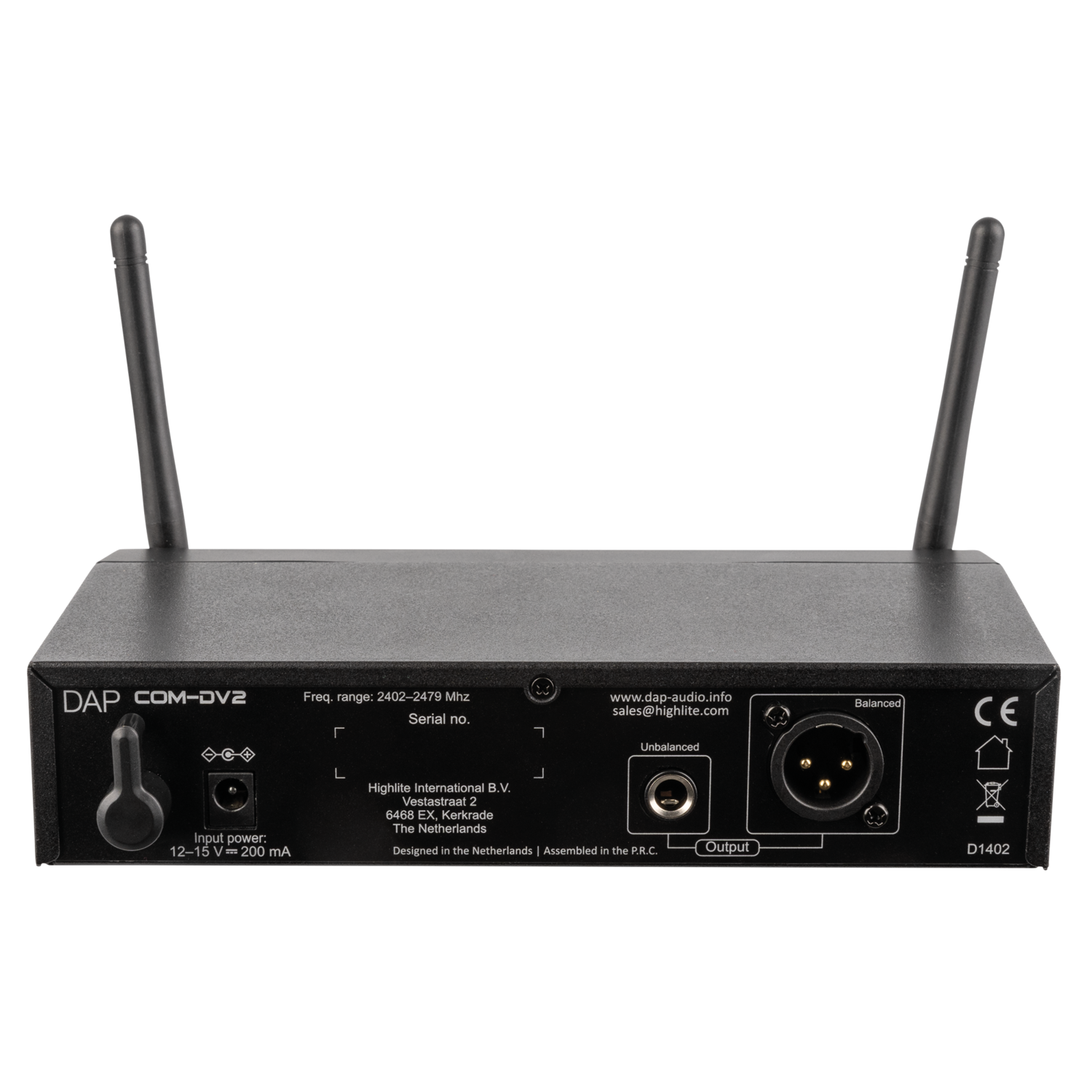 Il DAP COM DV-2 è un set microfono portatile wireless che opera nella banda 2,4-GHz, priva di licenza. Il microfono è dotato di una testina dinamica con 8 impostazioni di guadagno. Un convertitore interno a 24 bit/48 kHz prepara il segnale audio per la trasmissione wireless a bassa latenza. Il microfono portatile è dotato di un anello di indicazione di stato a LED che mostra comodamente il suo stato operativo attuale. Può durare fino a 10 ore con solo due batterie AA.
