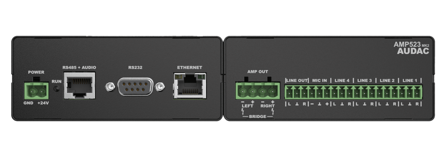 L'AMP523 è un mini amplificatore stereo con un'unità di controllo integrata basata sul web, dotato di quattro ingressi di linea stereo e un ingresso microfonico bilanciato con alimentazione phantom. Ha una potenza di uscita nominale di 2 x 15 Watt. Le sue funzionalità semplici e compatte, ma versatili, lo rendono perfetto per piccoli sistemi di altoparlanti che richiedono soluzioni audio compatte ed economiche, complete e facilmente controllabili. Alcune applicazioni tipiche sono aule scolastiche, dove il sistema audio verrà utilizzato in combinazione con una lavagna interattiva, uffici e sale riunioni, dove la musica deve passare automaticamente dalla musica di sottofondo alla voce o alla riproduzione all'inizio della presentazione, ... e molte altre applicazioni simili.