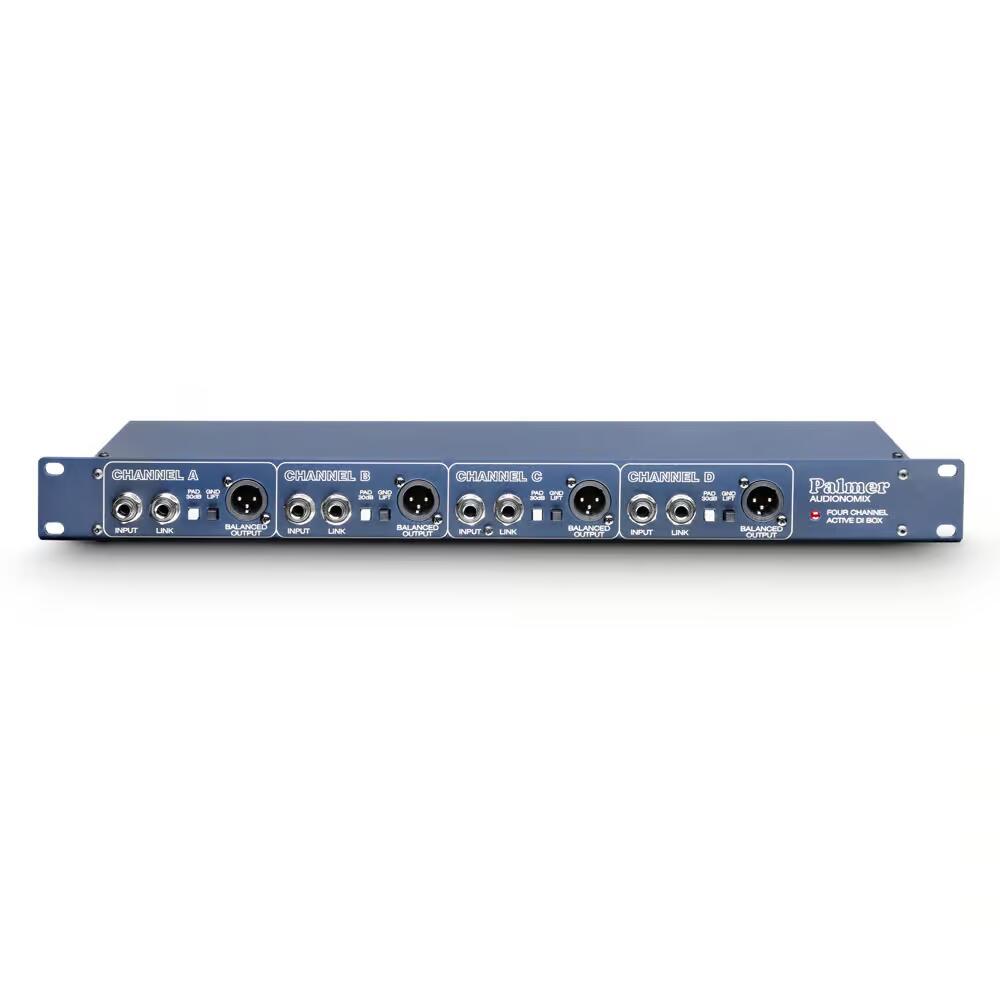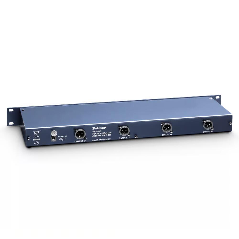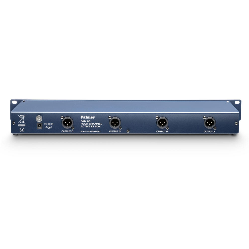 DI BOX attivo a 4 canali con corpo da 19". Ogni canale ha un ingresso jack con uscita parallela per la connessione loop through del segnale. L'interruttore del filtro (-30dB) permette di collegare a scelta il segnale di linea o degli altoparlanti. I dati tecnici sono uguali a quelli del PAN 02. Tuttavia con PAN 03 si utilizza in generale l'alimentazione in rete. Tutti i collegamenti e gli interruttori si trovano sul pannello frontale 1 HE, l'uscita XLR è disponibile come presa parallela sul lato posteriore. Corpo da 19"/1 U, profondità 90 mm