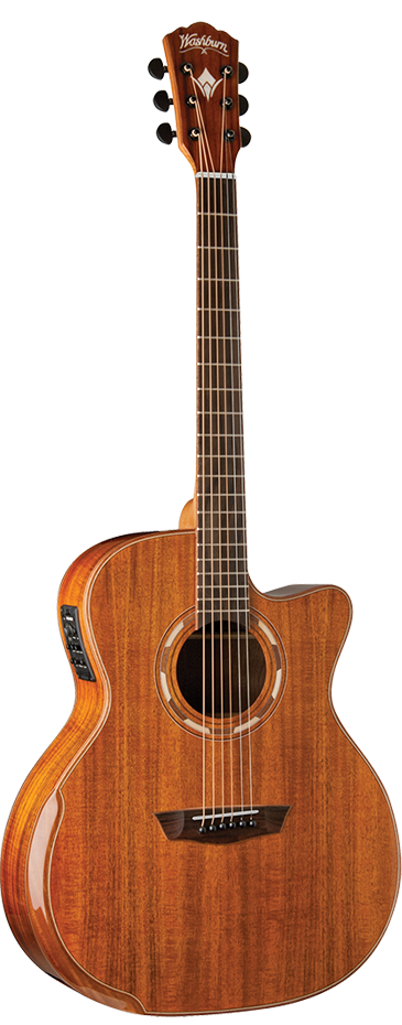 La G55SCE è una chitarra acustica elettrificata in stile Grand Auditorium con spalla mancante veneziana. La caratteristica originale della serie Comfort è il poggiabraccio ergonomico che fornisce il massimo comfort alla chitarra e, nel caso della G55SCE, diventa parte integrante della bellissima bordatura in mogano. La chitarra presenta un top in Koa, fondo e fasce in Koa, corpo e paletta bordati in mogano / acero. La tastiera in Ovangkol priva di intarsi e il ponte in Ovangkol bordato in mogano aggiungono alla chitarra un'aura di sobria eleganza. Una striscia di acero / mogano / acero divide anche il retro in Koa. La paletta presenta un logo Washburn perlato e una W stilizzata. La splendida rosetta in stile Washburn Parquet è realizzata alternando acero e mogano.